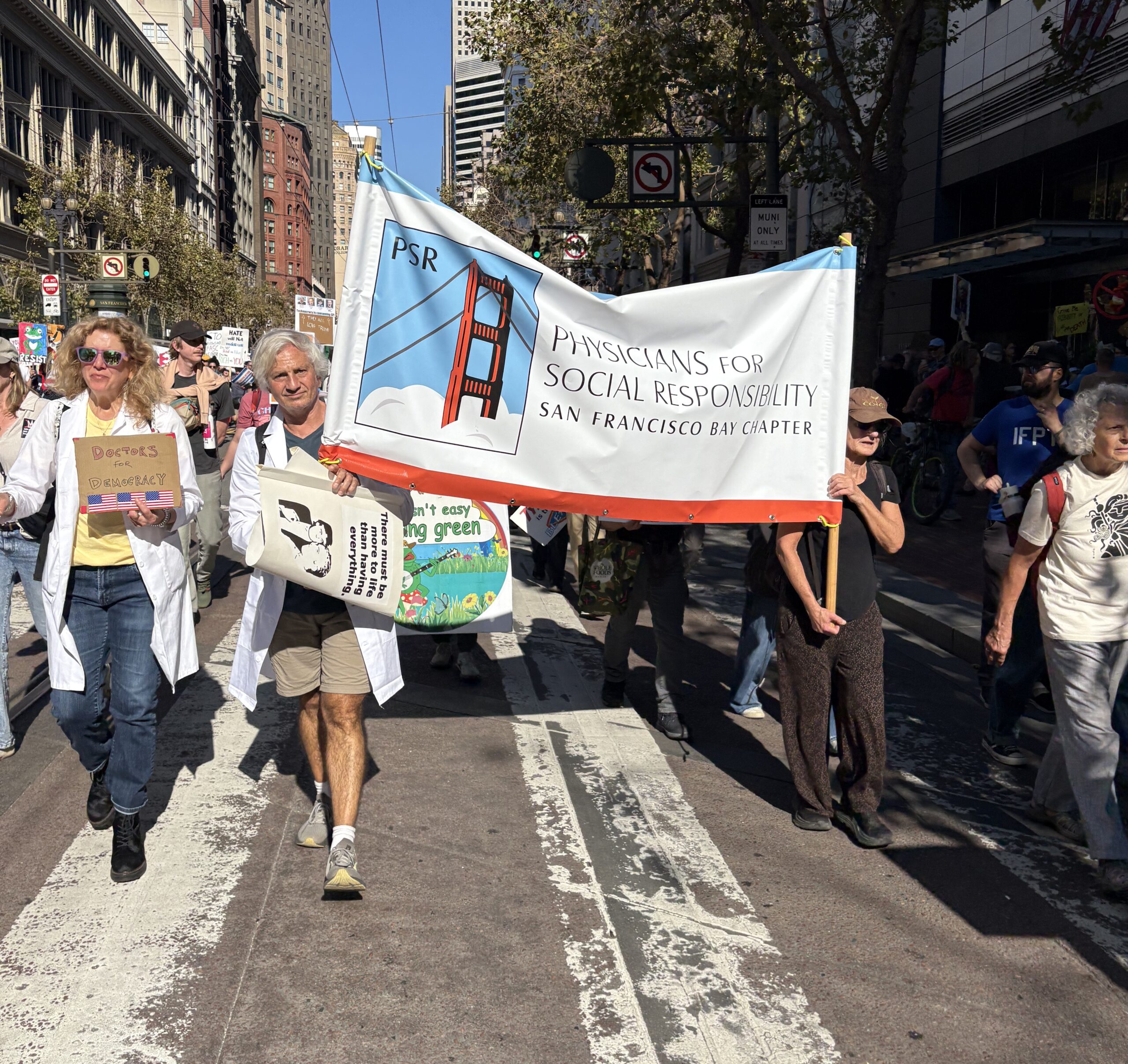 I’m Dr. Bob Gould. I’m President of the SF Bay chapter of Physicians for Social Responsibility. PSR nationally and through our chapter network represents thousands of health professionals. For more than four decades, we have been standing up for community and planetary health, and advocating for peace, environmental, racial and social justice. Democracy is a prerequisite to achieving our mission. We cannot and will not be silent now in the face of grave threats to our basic freedoms.